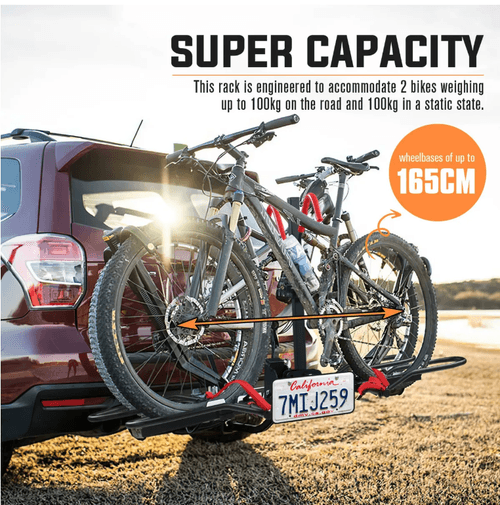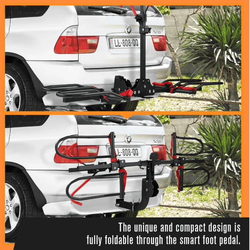 Use our car rear bike rack to increase convenience and ease when transporting bikes over longer distances. This bike carrier can resist tear, wear, and rust thanks to its robust construction. Besides, it can transport one to two electric bikes or mountain bicycles, with a maximum load of 70 kg on the road and 100 kg in a static state. For extra stability, the bicycle rack includes a bonus strap. Users can easily access the trunk due to a smart foot pedal tilt design. What’s more, a built-in locking mechanism helps secure the bikes to the rack for optimal safety, giving peace of mind to cyclists. Compact and fully foldable, this bicycle carrier boasts minimal storage when not in use. Applicable to all 2-inch hitch receivers, our bike storage rack is suitable for camping, outdoor adventures, and daily use.