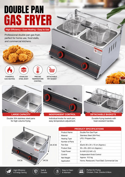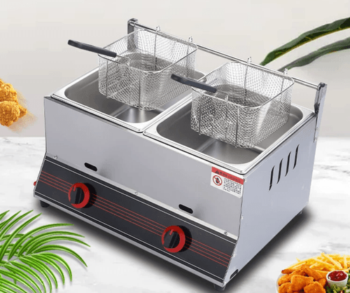 Double Pan Gas Deep Fryer, perfect for restaurants, takeaways, food trucks, night markets, or home use.