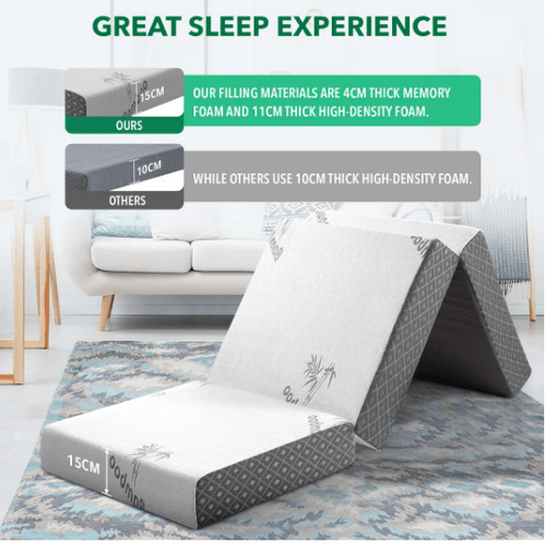 The Luxdream 15cm tri-fold mattress is constructed with a 4cm thick luxurious memory foam layer over an 11 cm thick supportive foam base for a great sleep experience.