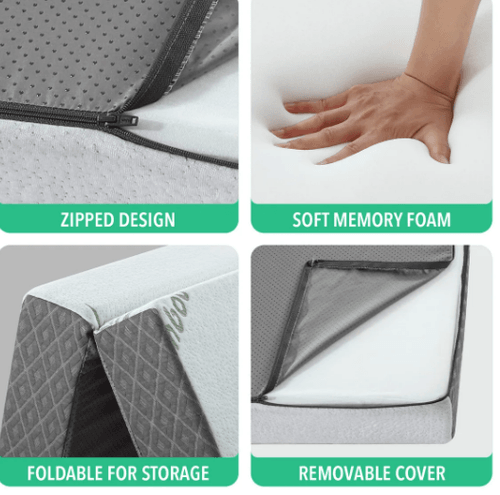 Includes a removable ultra-soft bamboo fibre cover with an anti-slip bottom and measures 190.5x63.5x15cm when being put flat and 63.5x63.5x45cm when folded.