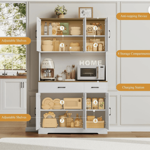 Management: The kitchen pantry cabinet is specially designed with outlets to make life easier, your daily household appliances can have quick power connection. Moreover, a wire hole still exists for your extra needs