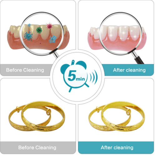 Experience professional-grade cleaning with our Ultrasonic Cleaner. Utilizing powerful 42KHz ultrasonic waves, it thoroughly cleans and disinfects dental aligners, retainers, whitening trays, night dental mouth guards, toothbrush heads, and even jewelry. The built-in UV lights automatically operate for up to 5 minutes, ensuring a 99.99% effective disinfection process. With dual cleaning modes - Pulse Deep Cleaning Mode and Regular Mode - you can choose the option that best suits your needs. The compact and portable design features a 304 stainless steel tank with a 200ml capacity, making it ideal for home or travel use. Enjoy hassle-free operation with easy one-button touch control and choose between 5-minute and 10-minute automatic shutdown options. Keep your dental accessories fresh and hygienic with our professional Ultrasonic Cleaner.